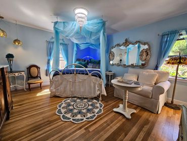 The Lotus Room welcomes you into a sanctuary of flowing renewal, where the water element surrounds you with calm and vitality. Designed for emotional release, inspiration, and gentle rejuvenation, it embodies the qualities of water—fluid, cleansing, and life-giving. Step outside into your own private Lotus Garden, where a koi pond reflects the sky, a tall fountain whispers in the background, and vibrant blooms sway softly in the breeze. Cozy seating invites you to linger among the greenery, while the entire space flows in harmony, offering guests a serene reminder that healing, like water, is a natural and continuous journey